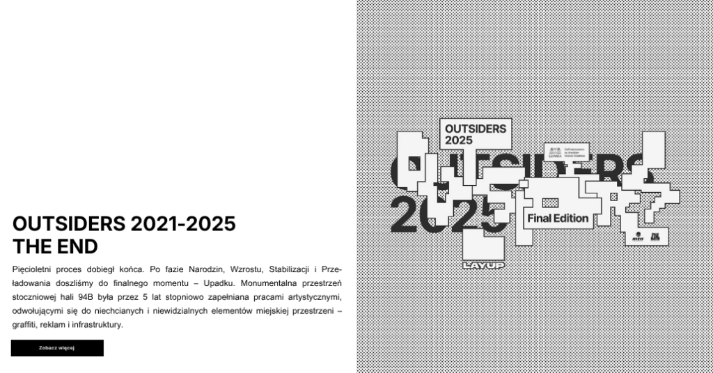 Yo!Już 26 kwietnia odpalamy Layup! To już ostatni sezon wystawy Outsiders – zaplanowany na 5 lat proces twórczy dobiega końca. Monumentalna przestrzeń hali 94b wypełniona pracami ponad 70 artystów z